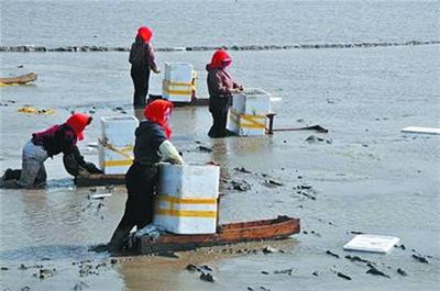 “岸边距离养殖区域约4公里,大约需要半个多小时。”养殖大户郑清涛介绍,这些蛏苗是从福建宁德运过来的,宁德人一般将蛏子叫做“蜻”,其实特指的就是缢蛏。他的缢蛏养殖面积约200余亩,这些蛏苗是前一天中午从福建出发,赶在退潮之前运抵胶州,担心路上出现意外,他单独给司机加了300元的辛苦费,单趟运输费用高达4300元。今年每斤蛏苗的价格约13元,每斤约2500—3000粒,通常每亩约投放160斤的蛏苗。
