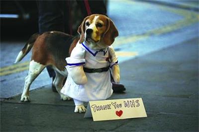 16日在英国伦敦拍摄的一只小狗与感谢医护人员的标语。疫情期间,每到周四晚八时,民众在阳台、门前或窗前鼓掌,表达对医护人员的敬意。