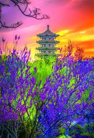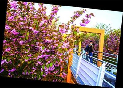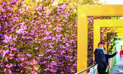 一周之前,李村公园的海棠大道美景称霸朋友圈,无数摄影师将镜头对准这里,如今,海棠花已经谢去,却丝毫影响不了这里的热度。海棠大道旁便是双樱大道,双樱树虽不及海棠树高大,却以高密度的花枝直击人心。这条道路自东向西贯穿大半个公园,多处路段粉红色的双樱花遮蔽天空,让人陶醉。居民们散步、赏景,摄影师取景拍摄这里是首选。黄昏时刻,金色阳光打在花枝上,繁花染上一片片高亮的金黄色,映衬着远处的景观塔,一幅公园春日晚景让每个人流连忘返。在李村公园湖水畔的蓝色桥廊此时也抵达颜值巅峰。蓝向黄的渐变色搭配粉红色透亮的樱花犹如画家调出的油画,不少孩子在廊桥上游玩嬉戏,爽朗的孩童笑声染透了樱花林。