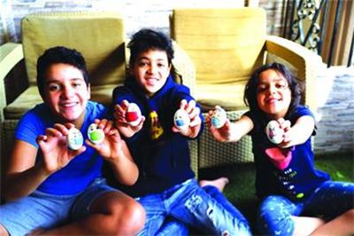 20日,在埃及首都开 罗 的 家中,孩子们展示自己绘制的彩蛋。当日是埃及传 统 节 日“闻风节”,今年受新冠疫情影响,不少埃及民众选择在家中度过这一节日。 新华社发