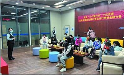 日前,晚报小记者研学团走进中国民生银行青岛分行,听银行的工作人员讲金融知识,生动的讲解,精彩的互动环节,让小记者们目不转睛,随后在大厅的各种“实地操作”,更是让同学们大呼“涨知识”。