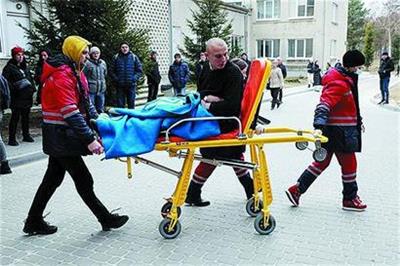 13日,乌克兰亚沃里夫,伤者被送往医院。