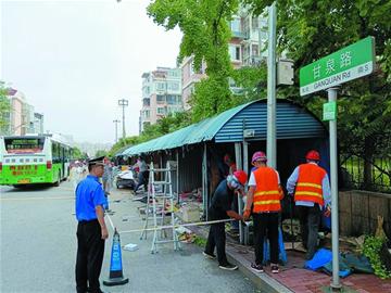 大棚拆除后露出人行道。工人们在拆除占据人行道的大棚。