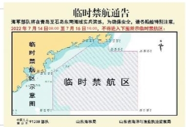 海军部队将在青岛至石岛东南海域实兵演练,为确保安全,请各船舶特别注意,2022年7月14日08:00至7月16日16:00,不得进入以下7点连线围成的临时禁航区: