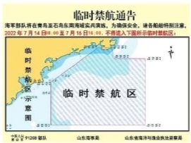 海军部队将在青岛至石岛东南海域实兵演练,为确保安全,请各船舶特别注意,2022年7月14日08:00至7月16日16:00,不得进入以下7点连线围成的临时禁航区: