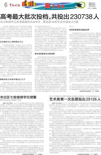 20日晚间,省招考院公布了《山东省2022年普通类常规批第一次志愿投档情况表》。记者注意到,普通类常规批第一次志愿投档中,高校共投出230738人。其中北京大学投出94人,清华大学投出73人,从两校录取线来看,均较去年有小幅降低。按照山东省2022年普通高校招生录取工作进程表,24日将公布普通类常规批第二次志愿计划,26日至28日将进行普通类常规批第二次志愿填报。