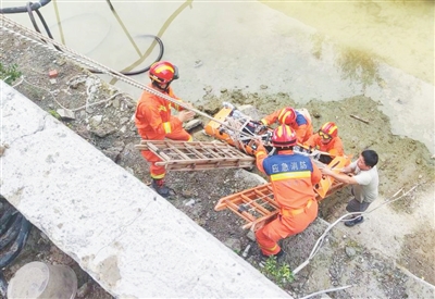 海王路消防救援站救援人员到场后发现,沟渠深约6米,一名男子躺在渠底不能动弹。救援人员考虑到男子可能骨折,他们立刻把多功能担架抬到沟渠中,将男子小心翼翼地转移到担架上,并用板带将他固定好。救援人员用梯子当滑轨,合力将伤者拉到了地面上。