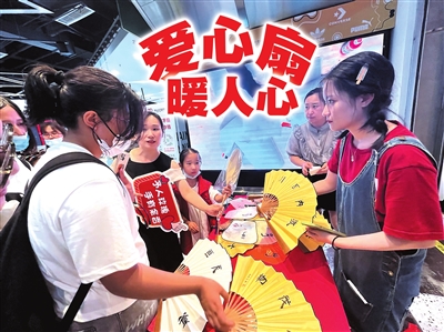 “阿姨,请问您能买一把扇子吗?”“叔叔,请帮助一下牛爷爷吧”……28日晚,熙熙攘攘的台东步行街恒泰广场B1楼多了一群身着红马甲的小朋友,他们用稚嫩的声音向市民游客推销“爱心扇”。连日来,从日照来青书写扇面卖字救儿的六旬老人牛西平牵动着青岛人的心,青岛市微尘公益基金会发起了帮牛西平义卖扇子的活动,来自青岛市南区实验小学的15名小学生成为微尘志愿者,不少热心市民也在现场用不同的形式表达支持,大家一起行动,为这个遭遇困难的小家撑起一把伞。