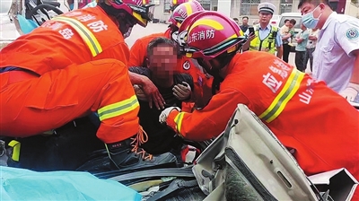 本报7月29日讯 29日清晨5时30分,胶州市胶西街道香港路马铁路路口发生车祸,一名男子被困在车内。接到求救电话后,杜村消防救援站立刻赶赴现场施救。