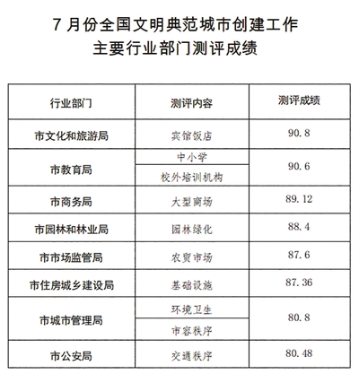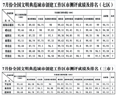 本报8月2日讯 按照市委、市政府部署要求,7月以来,青岛市创建全国文明典范城市工作指挥部委托第三方和相关职能部门,对10个区市文明城市创建工作分别进行测评。综合两方面测评结果,按照成绩高低,7个区排名为西海岸新区、崂山区、城阳区、即墨区、市北区、市南区、李沧区,3市排名为平度市、莱西市、胶州市。同时,依据第三方测评结果,对主要行业部门创建工作情况进行评价打分。测评成绩公布如右表。