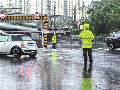 本报8月11日讯 11日上午,青岛再次迎来降雨天气,路面湿滑,部分道路出现积水,交通压力倍增。青岛交警雨中坚守岗位,全力疏导指挥交通。