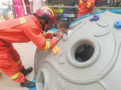 本报8月21日讯 21日中午12时37分,青岛高新区消防救援大队接到求救电话,在世茂52+商场3楼大厅游乐设施内,一名儿童在玩耍时,头部不小心被卡在游乐设施中。