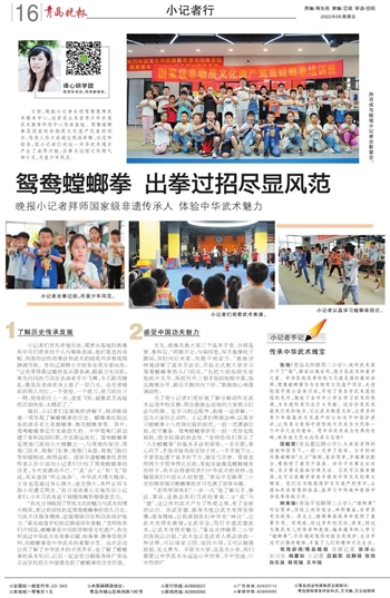 日前,晚报小记者走进鸳鸯惠博武术健身中心,这里是山东省青少年非遗武术教育研究中心传承基地。鸳鸯螳螂拳是国家级非物质文化遗产代表性项目,传承人孙日成通过现场讲解、示范和指导,使小记者们对这一中华武术瑰宝产生了浓厚兴趣,出拳与过招之间精气神十足,尽显少年风范。