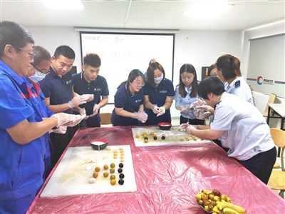 当天上午,公交隧道五分公司的志愿者,拿着做好的月饼,来到地下30余米的地铁施工现场,将热腾腾的月饼送到建设者手中,给他们“加餐”。“我们和地铁建设者一样,越是节假日越忙碌,因此才想到邀请他们一块来庆祝这一节日。”公交隧道五分公司经理周斌告诉记者,中秋节当天公司有十余对夫妻档要坚守岗位,304路驾驶员郭程涛和调度员杜娟娟就是其中之一。郭程涛的运行班次是固定早班,车有故障,无论多晚,他都会修好再下班,以此保证线路正常运行。杜娟娟每天清晨不到6时就要到岗,一边观察车辆运营动态一边回答驾驶员询问。节假日客流高峰期,更要加强监控、调度,确保线路车辆间隔均匀,让市民以最短时间坐上车。该公司党支部副书记刘长亮表示;“节假日,城市运营保障部门的工作人员坚守在岗位上,不能与家人团聚。我们举办此次活动,在弘扬传统文化的同时,为留青建设者加油打气,使他们能够以更加饱满的热情为争创全国文明典范城市助力。”