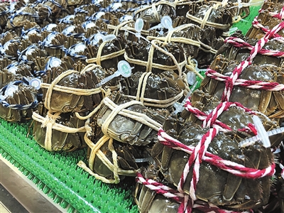 近些年,大闸蟹也渐渐进入岛城市民的视线,特别是中秋前后,正是大闸蟹上市的季节,如今中秋前,大闸蟹的广告“横行”各大小区、电梯间。几百上千元价格不等,搭配数量不同的大闸蟹,这种礼品券如今在青岛很火。较大的农贸市场也可以看到零售大闸蟹的身影,多产自微山湖、黄河口,价格从30元到90元不等。