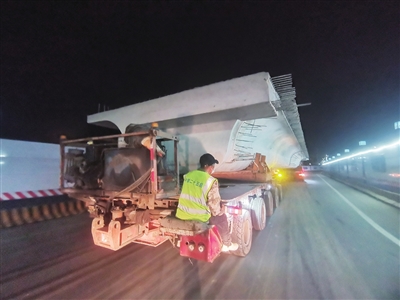 “相比现场浇筑箱梁,提前预制可以节省不少时间,为项目如期贯通奠定基础。”宋克坤表示,04工区共计需架设200榀箱梁,目前已经累计完成了157榀的预制生产工作。从本月7日架设首榀箱梁开始,架梁工作就转入了“快车道”:首次架梁一晚上只架设了3榀,当晚他们则计划架设5榀。“因为箱梁超重超长,架梁工作必须在深夜车流量较少时开展。”宋克坤表示,这些箱梁每榀重近200吨,长30米,需要用运梁“炮车”运送到辽阳路施工现场。为提高效率,当晚,他们动用了5台“炮车”,保证架梁工作的有序推进。