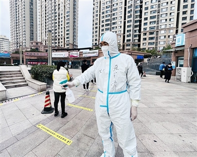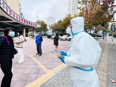 凌晨4时起床、4时30分出发、赶在5时前抵达普吉新区小区的下沉广场,引导居民们有序开展核酸采样工作……从11月4日开始,青岛市人大常委会人事代表工作室副主任张可功主动请缨,成为了市人大常委会机关抗疫志愿组的组长之一,带领小伙伴们吃住在社区,下沉到了大港街道普吉社区抗疫一线,与社区工作人员、志愿者一道为居民们运送物资、录入数据,还要负责联络。11月10日,记者见到他时,手机不时地响起,协调解决疫情防控的大情小事。“早上我们是不敢喝一滴水的,穿着这身防护服就要把工作干到位、落到实处。”张可功告诉记者,为了让居民们高效完成核酸采样,保证在中午12时前全部完成采样工作,10日普吉新区小区的核酸采样点已经从5个点扩容到了7个点,大大方便居民们尽快采样,减少排队等待的时间。