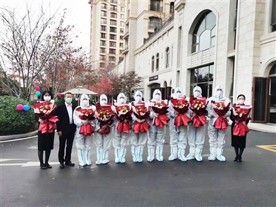 本报11月10日讯 “谢谢所有的社区工作人员和志愿者们,你们辛苦啦!回去也好好休息一下,这几天给你们添麻烦了。”日前,崂山区沙子口街道停云山庄临时管理区解封,小区业主为防疫工作人员送别、献花。