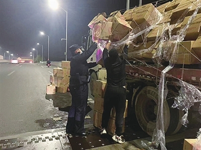 本报11月18日讯 16日晚,一辆重型半挂车行驶至胶州市尚德大道高架桥上,车上的货物突然侧翻,50多箱花生油散落一地,胶州市公安局上合示范区派出所民警发现后立刻帮忙清理。
