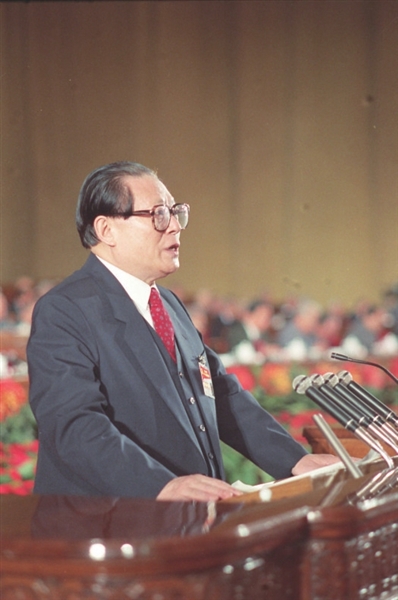 | 1997年9月12日,中国共产党第十五次全国代表大会在北京人民大会堂开幕。这是江泽民同志代表第十四届中央委员会作报告。 |