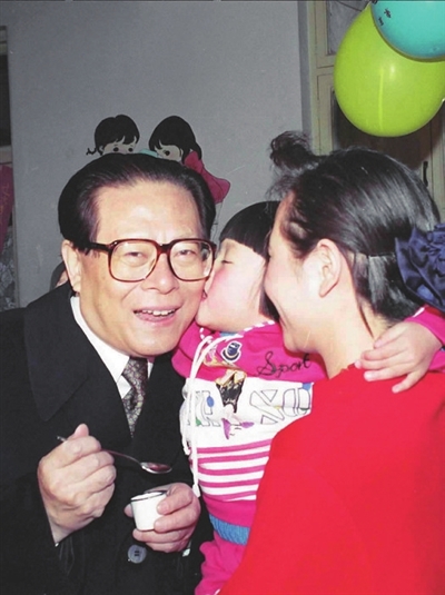 | 1993年12月5日,江泽民同志在北京为一位幼儿园儿童喂服脊髓灰质炎疫苗后,小朋友亲吻江爷爷。 |