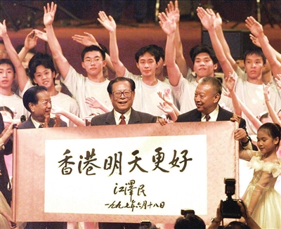 | 1997年7月1日上午10时,中华人民共和国香港特别行政区成立庆典在香港会展中心新翼举行。在庆典仪式上展示了江泽民同志亲手题写的“香港明天更好”书法卷轴。 |