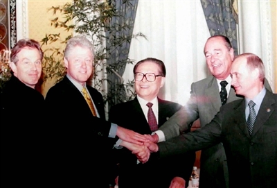 | 2000年9月7日,由中国倡议的联合国安理会五个常任理事国首脑会议在纽约举行。江泽民同志(中)同法国总统希拉克(右二)、俄罗斯总统普京(右一)、英国首相布莱尔(左一)、美国总统克林顿(左二)握手合影。 |