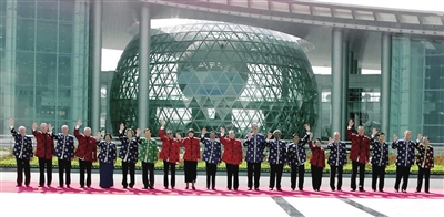 | 2001年10月21日,亚太经合组织第九次领导人非正式会议在上海举行。这是江泽民同志与参会的经济体领导人合影。 |