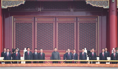 | 2019年10月1日,庆祝中华人民共和国成立70周年大会在北京天安门广场隆重举行。这是习近平同志、江泽民同志、胡锦涛同志等在天安门城楼上。