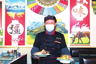 4日上午9时许,记者来到位于延吉路上的高台阶新疆风味餐厅时,远远便看见餐厅前排起了长队。走近一看,排队人员并不是等待进入餐厅的食客,而是在等待做核酸的市民。“虽然排队人群就在餐厅门口,影响了人员就餐,但这些人群也给饭店带来了人流。”个子不高,穿一身干净的厨师服,讲带着新疆口音的普通话,这是杨殿民给大家留下的第一印象。今年50岁的杨殿民,老家在新疆昌吉州奇台县。杨殿民的爷爷,从陕西前往新疆谋生,此后一家人便在新疆扎根。杨殿民兄弟姊妹十一人,他在家中排名第十。或许是受在县招待所干厨师的姐夫影响,从小他就对做饭格外感兴趣。平时在家,也是他负责给父母做饭。