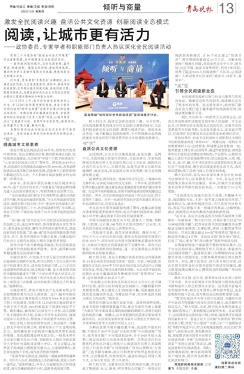 韩大钧介绍,为激发社区居民的阅读兴趣,青岛打造了集阅读、社交、教育、研究等综合功能于一体的社区阅读服务新模式,在16个社区建立“悦读书房”,图书借阅流量超过10万人次。为解决阅读推广精准化问题,青岛依托全市中小学、图书馆、社区书屋、农家书屋等场所,利用3年时间,培养了超过1000人的阅读推广人队伍,让阅读推广人带动更多社区居民“爱读书、读好书、善读书”。