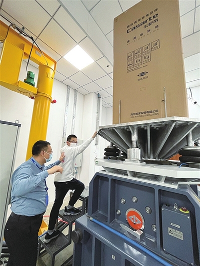 站在庞大的振动台前,小记者们纷纷向其投去“仰视”的目光。随着实验室主管满明强挥手示意,工作人员启动振动台,轰鸣声顿时响起,且越来越大,固定在设备上的一台冰箱频繁晃动起来。孙东昊等小记者在满明强的引导下亲手触摸到了振动台,不由睁大眼睛,面部表情也随之精彩起来,从忐忑到惊讶,再到震撼,小记者们兴奋不已,发出连声惊叹。