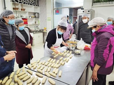 本报12月8日讯 为了将疫情阻挡在社区外,社区的志愿者们暂别家人,全身心投入疫情防控中。随着防疫进入常态化,为了鼓励他们重新拾起因为防疫落下的手艺,多陪伴家人,李村街道向阳路社区将技校制作面点的老师请进社区,为志愿者们传授技艺。