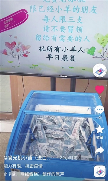 “有需要的可以过来领了,我直接把冰柜放在门口,你们来了直接拿就行。”这是“食光机小铺”在抖音上发布的一则短视频,冰柜就放在商铺门前,后面还立着显示器写着“免费老冰棍,限已小羊的朋友,每人限三支,请不要冒领,留给有需要的人,祝所有小羊人早日康复。”不少住在小铺周边的邻居看到了视频后,前来领取老冰棍,给正在发热的家人降降温。