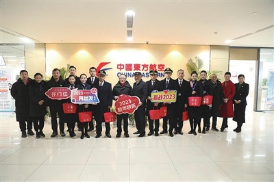 1月1日清晨,东航山东分公司相关负责人在青岛胶东机场为2023年起飞的第一个航班机组送去新年祝福。元旦小长假,青岛机场旅客出行主要以探亲访友、假日旅行人员为主,出港热门出行地点为上海、哈尔滨、成都、重庆等城市。