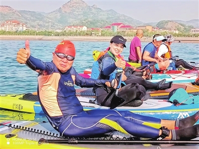 “我感觉冬泳相对比较单调,目前世界及国内比较流行桨板运动,这项运动门槛比较低,还能实现自己的诗和远方。是非常适合老、中、青三代人的一项浪漫时尚的海上运动。”姜阿东说,在他的影响下,慢慢吸引了周围已经退休、年龄相对大的水上运动爱好者。