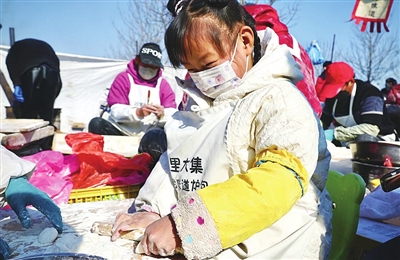 “爸爸妈妈太忙了,我放假也没事,就想来帮帮他们。”今年放寒假后,懂事的兄妹俩就跟着妈妈来赶集。哥哥李昊轩很健谈,他从两三岁的时候就跟着赶大集,不到8岁就会擀皮。“在大集上没得玩,大人就给我一根擀面杖、一些面粉、面剂子,慢慢就会擀皮了。”妈妈教李昊轩擀皮,爷爷教会他一次擀两个面剂子,他自己又摸索着增加难度,现在已经可以将7个面剂子叠在一起,十几秒就能擀出7个包子皮。妹妹程好好也不示弱,安安静静地坐在对面擀皮。