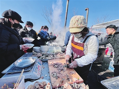 羊肉汤、海鲜烩饼、炉包、年糕……泊里大集堪称岛城最好吃的大集。吃到美食的那一刻,记者顿时把换乘地铁、公交的疲惫一扫而光。羊肉汤是泊里大集的最强阵容,每个摊位都支起了大锅,冒着热气腾腾的烟火气。去年,脱口秀达人徐志胜喝泊里羊汤,再一次让泊里羊汤在年轻人中“出圈”。“今天一天能卖十七八头羊!”记者喝了最火的“振华全羊”,中午11点多已排起了十米长队,姓苗的老板娘淡定地切肉、称肉,一旁的大锅里滚着泛白的羊肉汤,只需三五分钟,一碗地道的泊里羊汤就做好了。海鲜烩饼也是大集上的“爆款”。在阿伟海鲜烩饼摊位前,同样排起了长队,老板王伟操控着三个炒锅,各种海鲜、手切大饼,在他的一番操作下,变成了汤汁浓郁、鲜香四溢的烩饼。大集上的年糕、炉包也不要错过,都是地地道道的家常味道,用料扎实,吃一口都是家的味道。