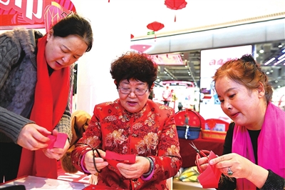 剪纸展示摊位前,身着红色唐装的程丕昉正在剪纸。只见她手执一把小巧的剪刀,红色的卡纸在手中翻转,不一会儿,一只惟妙惟肖的小兔子便呈现眼前。“这是‘胶州剪纸’,既融有纤巧工秀、装饰浓郁、近于写实的南国情韵,又保留粗壮质朴、简练明快、崇尚概括的北方基调特点。”程丕昉介绍说。同样双手翻飞的还有程丕昉身后的孙展平,针线在她手中飞快地在红色的绣布上穿进穿出,很快,一朵漂亮的水仙花跃然布上。“鲁绣是一种传统刺绣工艺,是山东地区的代表性刺绣。它不仅是国家非物质文化遗产,还是中国‘八大名绣’之一。经过多年发展与其他绣法进行了融合,保留了‘鲁绣’的质感逼真又兼具‘苏绣’的清隽淡雅。”孙展平说。