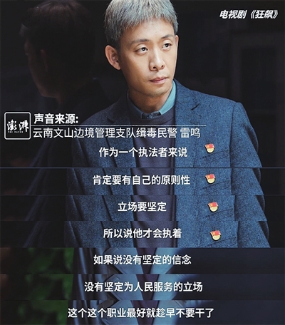 雷鸣在接受专访时称,目前还没有时间来看这部剧,因从小受军人父亲的熏陶,便义无反顾成为了一名警察。雷鸣说,真实的缉毒行动,远比影视剧更加残酷和凶险,现场不确定性因素太多。由于毒品犯罪存在隐蔽性强、取证难,加之毒贩可能持有武器等特点,雷鸣和战友们等同于行走在刀尖上,所承受的高压难以想象。谈及对《狂飙》中主角安欣的理解,雷鸣表示“一定是坚定的信念在支撑着他”。据澎湃新闻