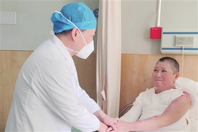 “我今年54岁,家住平度,去年12月15日因家中失火被大面积烧伤。”范女士说,烧伤未愈又不幸感染了新冠肺炎,家属就赶紧联系转院到了青岛市市立医院救治。据主管医生袁家德介绍,患者的火焰烧伤严重,且呼吸道烧伤,尤其合并新冠肺炎后,高热不退,病情比较危重。在烧伤科王野主任的指导下,袁家德带领团队制定了严谨规范的抢救治疗方案,护士长郑鹃带领护理人员进行精心护理,患者安稳度过了休克期和感染期,并于1月17日进行了植皮手术,手术很成功,范大姐再恢复几日就可以出院了。范女士说,大年初三,袁家德明明休息,却还不忘来医院给她换药,遇见这样的医生真是自己的幸运。袁家德医生却谦虚地说:“你真正要感谢的应该是护士赵静呀!没有她,你的手术可能会延期。”