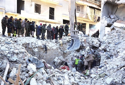 2月8日,救援人员在叙利亚阿勒颇的一处地震废墟搜救。新华社发