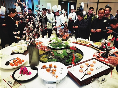 活动现场发布了李沧的“梅花宴”,特别邀请李沧区的十余家李沧名店的名厨巧思创意,以李沧名景十梅庵的梅花为创意源泉,结合本地食材特色,“冰境梅香”“傲雪踏春梅”“梅酒小排”“梅弄鸭舌方”“梅花绽放”“梅花胭脂藕”“喜上梅梢”“红梅春笋酿虾胶”“国潮梅花酥”等十余道创意非凡的梅花主题大餐,一上来就吸引了大家的注意力。