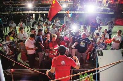 即将到达终点瓜德罗普岛时,岛上出现了让徐京坤不曾预料的一幕:码头上站满了迎接他的人群,还播放着他最喜欢的歌曲《真心英雄》,“我之前在瓜德罗普岛没有任何认识的人啊。”靠近后徐京坤才发现,这都是当地的华人华侨,大家身穿印有五星红旗的衣服,带着横幅,围满了整个码头,为这名中国船长欢呼雀跃。300人的队伍,为徐京坤组成了138支赛队里最庞大的迎接团队。“我后来才知道,他们从下午2点一直等我到傍晚6点,没有一个人离开。”鲜花香槟、欢呼掌声中,徐京坤热泪盈眶。“当时欧洲媒体用‘China Magic’来形容这个场景,他们很难想象这些人群是从哪里来的。”