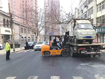 3月21日,市南交警隧道中队调来铲车和拖车,将一辆长期占用定陶路公共泊位的“僵尸车”拖走。据中队民警介绍,他们前期巡逻时发现了这辆已经有三个周期脱审的货车,随后通过车牌、车型、发动机号和车架号等信息联系车主,要求对方限期驶离。由于对方并未驶离,3月21日,交警调来拖车将车拖走。