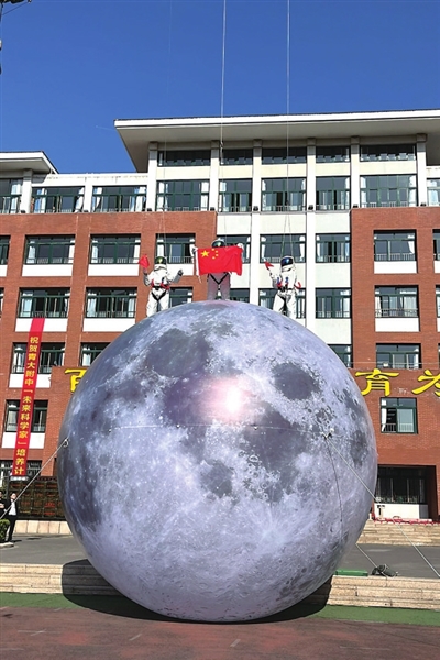 最引人瞩目的一刻,出现于青大附中“山鹰一号”登陆月球模拟展示环节。随着青大附中党总支书记、校长张凤瑛一声令下,“山鹰一号”飞行器直冲云霄,随后三名身着“宇航服”的学子代表出现于校园硕大的月球模型旁,当他们顺利抵达月球顶端时,操场响起热烈的掌声。前所未有的科技体验,让各位嘉宾和现场观众感受沉浸式“登月计划”。