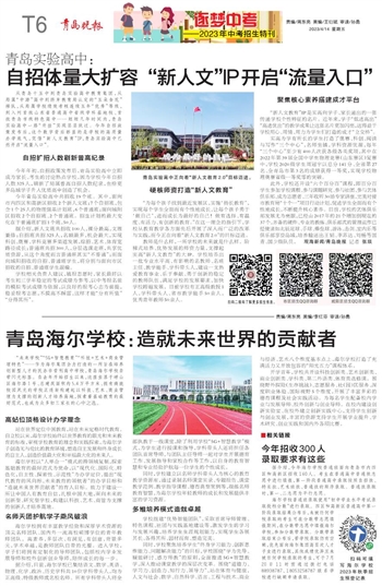 据介绍,今年海尔学校招生计划共招收300人。其中自招批面向市内四区和高新区招收140人,按照1:1比例确定自招资格学生,学生中考投档分数不低于普高一段线;第一组合不低于B;第二组合不低于C。普通批面向全市招收160人,最低控制分数原则上为一段线上上40分(含40分);第一组合不低于B;第二组合不低于C。