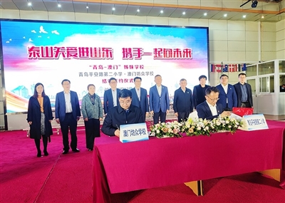4月13日,“泰山关爱进山东”澳门参访团一行走进青岛平安路第二小学,澳门坊众学校助理校长许文禄和青岛平安路第二小学校长王岩林郑重签字,“青岛-澳门”姊妹学校正式结对,开启双方交流合作的新篇章。省政协常委、澳门山东省社团总会理事长陈捷,澳门街坊会联合总会荣誉会长姚鸿明,省政协委员、澳门山东社团总会执行会长冷垚,省政协委员、澳门山东社团总会常务副会长江毅,澳门坊众学校助理校长许文禄,青岛市市北区委常委、市北区海外联谊会会长姜克源,山东省海外联谊会秘书长李跃文,青岛市海外联谊会秘书长关姗,青岛市市北区教育和体育局局长罗东,青岛平安路第二小学校长王岩林和与会嘉宾、师生共同参加活动。