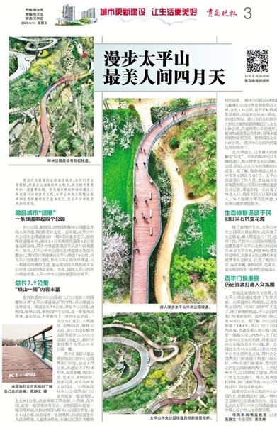 “漫步太平山,最美人间四月天。”这是太平山绿道贯通之际,带给市民最直观的美感体验,而本报昨日以此为题的一组报道,让这份美感迅速在青岛人的朋友圈晕染开来。“约上老友,去跑一圈太平山绿道,感受一下!”“读了《太平山赋》,知道太平山藏着这么丰富的历史,更应该去走走看看了!”美文赋能美景,太平山绿道直达“美美与共”,让众多青岛人起了去太平山踏青赏景的兴致,去时尚的绿道穿越时空进入近代青岛起源的历史现场。