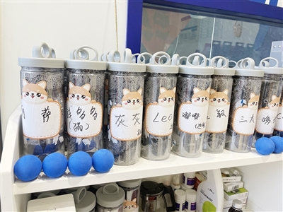 温和的灯光,一尘不染的地面,没有异味,没有毛发满天飞,很难想象这是一家给宠物洗澡、护理的小店。念念告诉记者,店里洗护都是“一猫/狗一人”,一对一服务完,当场消毒,干湿分离的洗护区安装了两台大型换气设备,每只动物洗护结束,立刻换气、消毒、清扫,确保环境干净。洗护区外的架子上整齐排放着毛巾桶,每个桶标注好了宠物名字、品种,念念说,这是来店里洗澡的小动物的专属毛巾,这样可以避免交叉感染皮肤病。